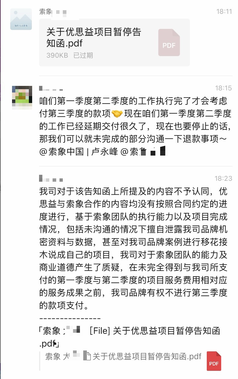 优思益公布的部分与索象公司的沟通记录 图片转自优思益微信公号