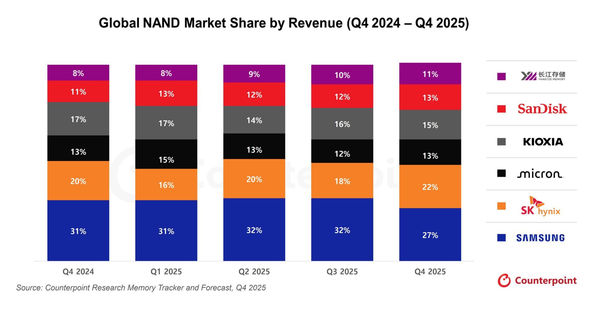 市场调研机构Counterpoint Research的报告显示, 2025年第四季度全球NAND存储市场份额中,长江存储占比11%,位列第六。第一至第五分别为三星(27%)、SK海力士(22%)、凯侠(15%)、美光(13%)、闪迪(13%)。